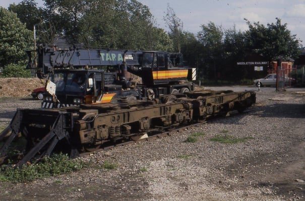 The bogies originally arrived at the Middleton Railway in June 1990 - see photo - and were the last through freight from BR onto the railway. Since then they have been stored at Middleton and more recently at the Midland Railway - Butterley. When the bogies were acquired we expected 27000 to have a more active life in preservation than has been the case, following the closure of the West Yorkshire Transport Museum. We have been paying storage for the bogies since 1990 so passing them on to the IDRS for rebuilding very much benefits both parties.