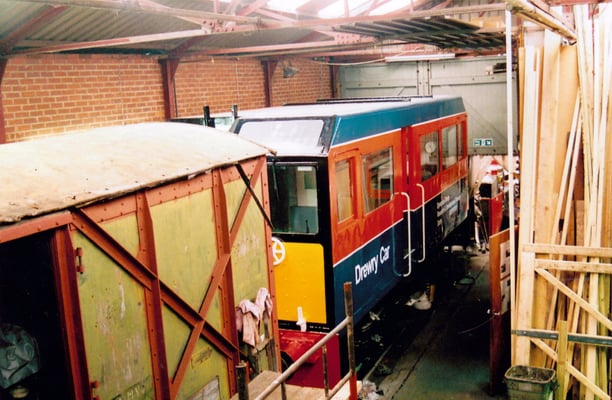 The vehicle is now at the Middleton Railway in Leeds, West Yorkshire, where it is hoped to convert the car, which weighs a mere 16.5 tons and is 29ft long, for use as a passenger carrying vehicle for public service. Since arrival she has acquired the nickname Olive (Overhead Line Inspection VEhicle) and on 27th June 1998 was successfully operated under her own power, probably for the first time in over 5 years!